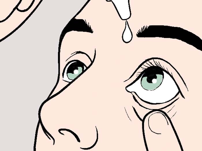 Mit einem Finger den kleinen Bereich am Nasenrand des leicht drücken. So wird verhindert, dass der Tropfen über den Tränenkanal in den Rachen läuft. - Danebengegangen? Wegwischen!