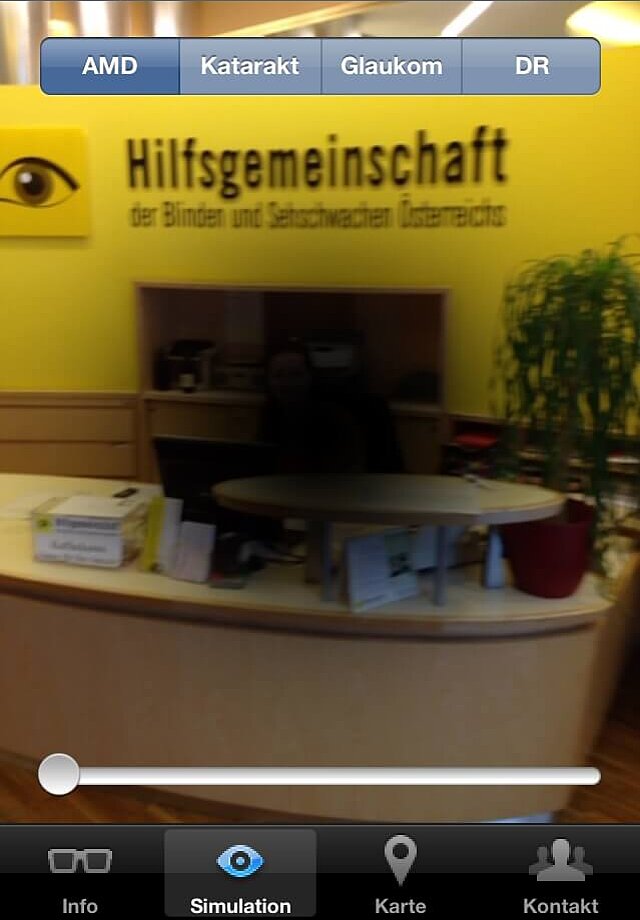 Wie nimmt man seine Umwelt wahr, wenn man an Altersbedingter Makuladegeneration (AMD) erkrankt ist? Das reduzierte Sehvermögen bei AMD, Grauem Star (Katarakt), Grünem Star (Glaukom) und Diabetischer Retinopathie kann mit der Anwendung simuliert werden. Mithilfe der Kamera des iPhones bzw. iPads können Benutzer selbst erleben, wie sich diese Augenerkrankungen auf die Wahrnehmungsfähigkeit auswirken.