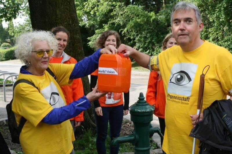Bevor es losgeht, befüllen wir noch an einem nahegelegenen Brunnen, einen kleinen Wasserkanister. Dieser dient als Symbolik für den Akt des Wasserholens. Da wir die ersten Teilnehmer sind, die mit ihrer Wanderung diese besondere Spendenaktion unterstützen, dürfen wir den Wanderweg feierlich eröffnen.
