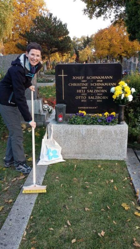 Wir reinigen die Grabsteine, entzünden Kerzen und schmücken die Gräber mit Blumen. Dabei gedenken wir unserer Testamentsspenderinnen und -spender. Viele davon durften wir selbst persönlich kennenlernen und so erzählen wir einander berührende Geschichten, die wir mit dem jeweiligen Menschen erlebt haben.