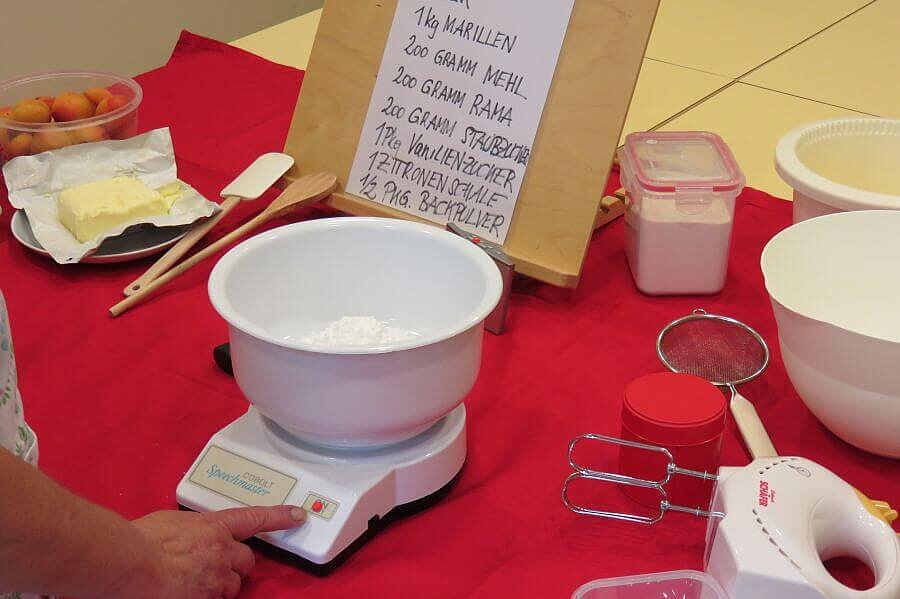 Elisabeth Gavura ist sehbehindert. Zum Backen eines Marillenkuchens greift sie auf eine Vielzahl von Hilfsmitteln zurück: Sprechende Küchenwaage, Lesepult, Lupe, Messbecherset, sprechender Tischwecker und Markierungspunkte.