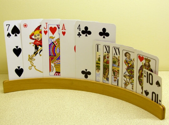Riesenschnapskarten, wie sie bei uns im Hilfsmittelshop erhältlich sind, verfügen über ein extra großes Format (19,5 x 12,2) und sind somit besonders gut für Spielerinnen und Spieler mit Sehbeeinträchtigung geeignet. Zudem verfügen die Karten über ein besonders griffiges Material.