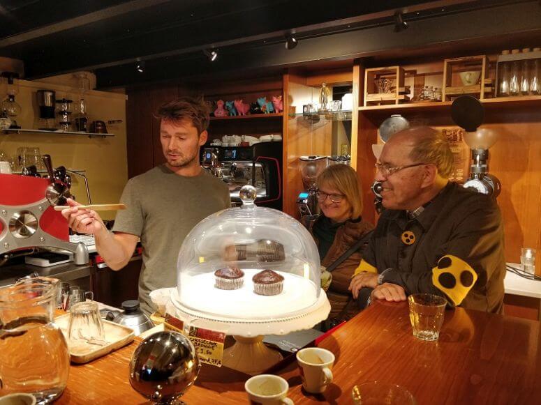 Erst bekamen wir einen Esperesso mit schokoladigen und nussigen Noten in einer Siebdruckmaschine zubereitet. Für die meisten von uns war das der klassische Kaffee, denn der zweite den wir verkosten durften, hatte zitronige frische Noten, ein moderner Kaffee. Der dritte war mit einer Handfilterkanne zubereitet und für alle geschmacklich eine neue Erfahrung. Wir haben daraus gelernt, es kommt auf die Bohne an, den Mahlgrad, das Wasser, die Maschine, das spezielle Fachwissen eines Barista und auch die Tasse.
