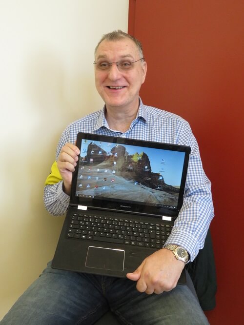 Ich bin Gerhard Kaspar, 60 Jahre alt und sehe nur im Zentrum gut. Meine linke Körperhälfte kann ich aufgrund eines Schlaganfalls nur sehr eingeschränkt verwenden und am rechten Auge bin ich blind. Ich biete für sehbehinderte Mitglieder in der Hilfsgemeinschaft Laptop Support an. Ich versuche mit dem Mitglied gemeinsam eine sehbehindertengerechte Umgebung zu schaffen, sodass die Person sich im Alltag wieder besser zurechtfindet.