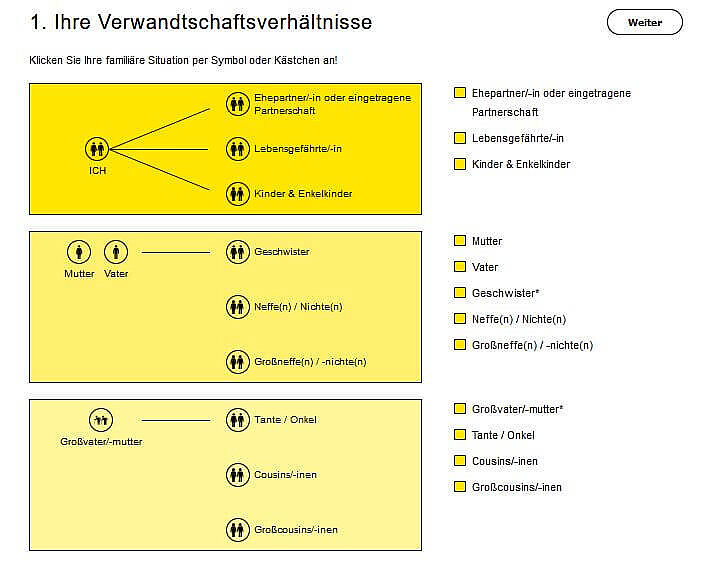 Im zweiten Schritt sehen Sie, welche Angehörigen einen gesetzlichen Anspruch haben (Pflichtteil) und wie hoch der Anteil ist, über den Sie mittels eines Testaments frei verfügen können. Nur wenn Sie ein Testament schreiben, können Sie zusätzlich jene Menschen und Institutionen bedenken, die Ihnen etwas bedeuten.