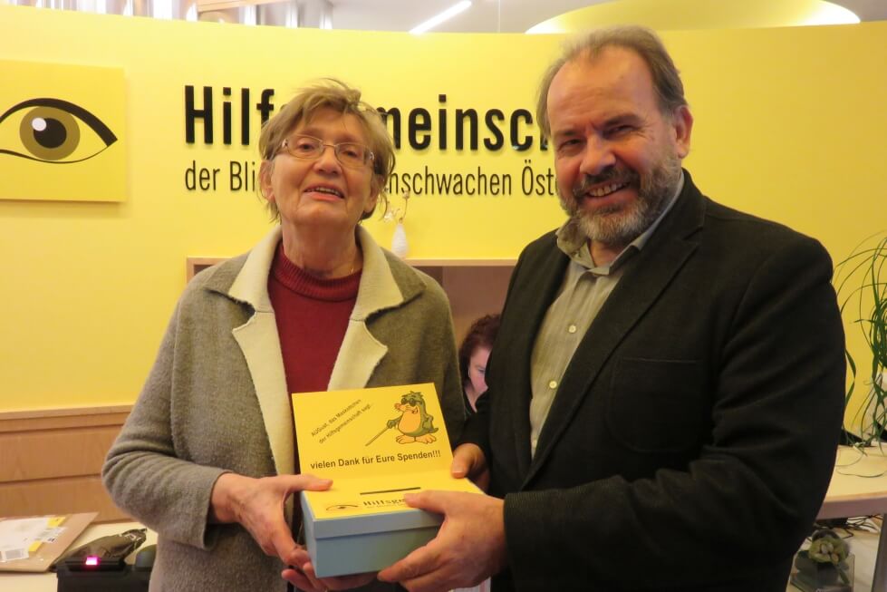 Anfang November 2019 übergab Gertrude K. beim Bezirksgruppentreffen Donaustadt die bestens gefüllte Spendenbox an Hubert Wagner von der Hilfsgemeinschaft. „Diese private Initiative von Frau K. war wirklich vorbildlich“, lobte der Bezirksgruppenleiter.