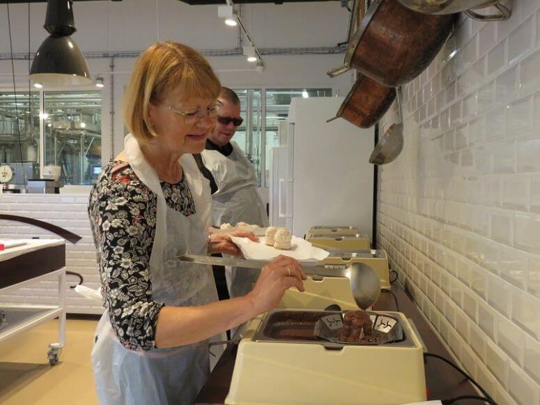 Die Hilfsgemeinschaft hat im Mai die bekannte Produktionsstätte von Niemetz besucht, wo die köstlichen Schwedenbomben hergestellt werden. In einem Workshop haben wir unsere eigenen Schwedenbomben produziert und auch etwas über die Geschichte von Niemetz erfahren. Aus einer Waffelbasis haben wir die Grundform festgelegt. In die wurde die geheime Rezeptur an süßem Schaum hineingespritzt und dann mit dunkler, weißer oder Milchschokolade glasiert und anschließend mit verschiedene Toppings dekoriert.
