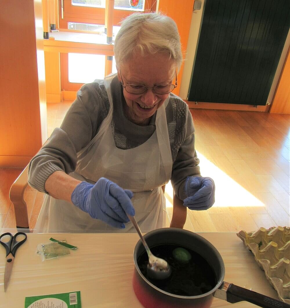 Alle MitarbeiterInnen kennen Frau T. beim Namen und kennen ihre Bedürfnisse. In dieser positiven Atmosphäre hat Frau T. gleich Kontakt zu anderen BewohnerInnen gefunden. Begeistert nimmt sie an Aktivitäten wie Spielenachmittage, Gymnastik, Gedächtnistraining oder Ausflüge in die Umgebung teil. Frau T. macht überall mit und vor Ostern hatte sie viel Spaß beim Färben der Ostereier.
