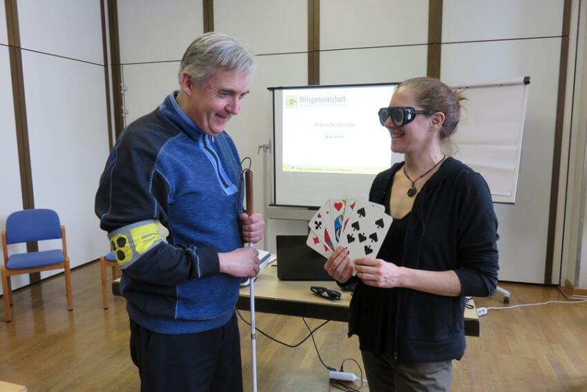 Vorsichtig lässt die junge Frau den weißen Taststock über den Boden gleiten. Pendelnd beschreibt sie Halbkreise vor ihrem Körper und macht dabei kleine Schritte vorwärts. Weil sie eine Augenbinde trägt, muss sie sich auf ihren Tastsinn verlassen. Dabei wird sie aufmerksam von ihrer sehenden Begleitperson beobachtet, die bereit ist einzugreifen, wenn Gefahr droht. „Achtung!“, ruft diese plötzlich. Die „blinde“ Frau bleibt abrupt stehen: „Wovor soll ich mich in Acht nehmen? Ich kann ja nichts sehen!“
