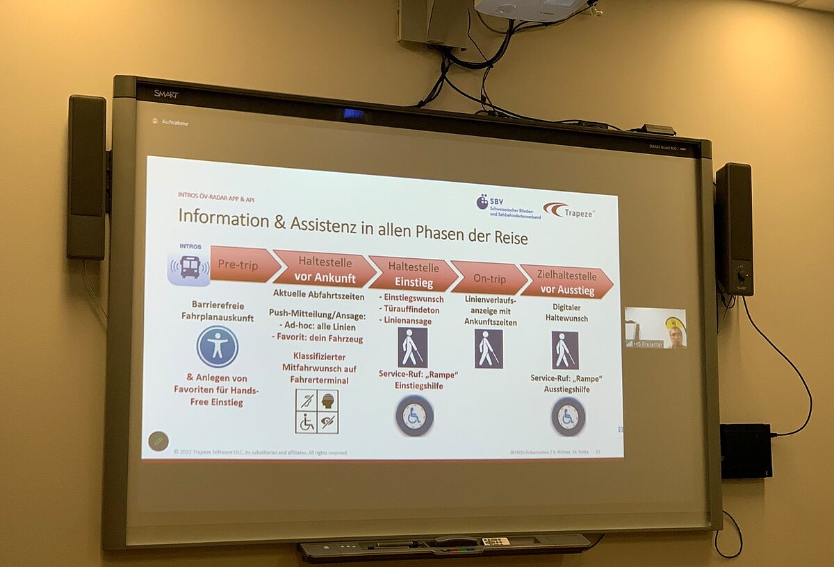 Trapeze-Elgeba GmbH aus Berlin hat ebenfalls eine App als technische Lösung für barrierefreie Mobilität entwickelt, vorgestellt von Product Manager Manfred Retka. Intros ÖV Radar funktioniert wie ein Orientierungssystem per App, das Menschen mit Sehbehinderungen oder Mobilitätseinschränkungen hilft, sich im öffentlichen Verkehr zurechtzufinden. Die App ermöglicht dem User live-Fahrplaninformationen, zeigt Haltestellen in der Nähe und bietet die Navigation im Liniennetz. Der User kann außerdem abrufen, welche Fahrzeuge gerade eingefahren sind, kann den User zum gewünschten Fahrzeug navigieren und einen Hands-free Einstieg ermöglichen. Im öffentlichen Verkehrsmittel kann der User dann nochmal die Infos der Linie abrufen und einen Haltestellenwunsch äußern, der direkt an das Fahrpersonal geht. Die App ist bereits in einigen Bundesländern Deutschlands implementiert und kann von Leuten ohne Smartphone auch alternativ mit einem Handsender genutzt werden. Trapeze ist außerdem Teil von "LOC.id“, einer Meta-App, die smarte Infrastruktur erkennt und dem User die jeweils relevante App anzeigt. LOC.id soll die Auswahl der richtigen App für ihre Bedürfnisse erleichtern. Die Lösungen von Trapeze-Elgeba sind konfigurierbar und ermöglichen eine individuelle Anpassung an die Bedürfnisse der nutzenden Person.