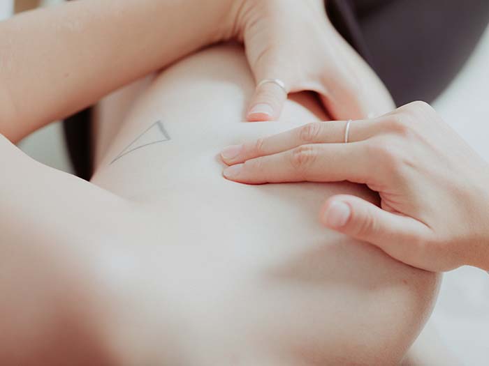 Vorm Spiegel stehend lassen sich äußerliche Veränderungen wie Rötungen, Farbveränderungen oder Auffälligkeiten der Hauttextur gut erkennen. Durch Heben und Senken der Arme kann man die Bewegung der Brust beobachten. Beim leichten Abstreichen mit den Fingern sollte man auf heiße Stellen achten.Abtasten im Liegen