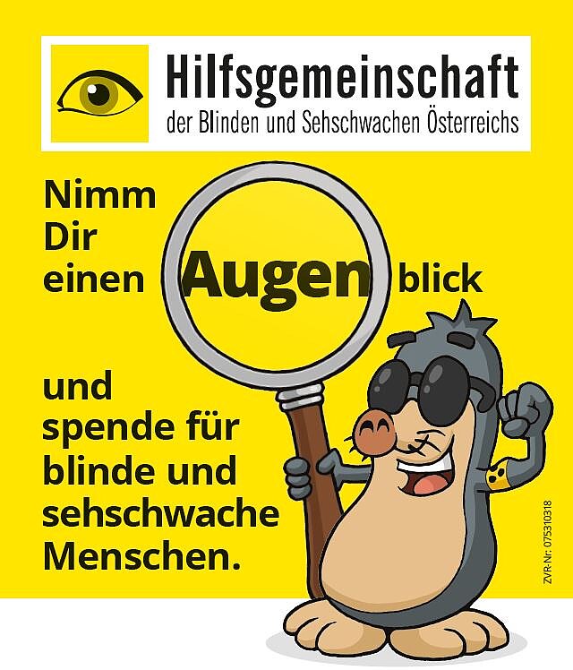 Der freundliche Maulwurf AUGust weist darauf hin, dass blinde Menschen Unterstützung zur Bewältigung des Alltags brauchen und bittet um Spenden für die Hilfsgemeinschaft der Blinden und Sehschwachen Österreichs. Im Jahr 2020 hat die Hilfsgemeinschaft für die mehr als 4700 ordentlichen Mitglieder etwa 10.000 Beratungskontakte im persönlichen Gespräch, per Mail oder Telefon sowie an die 3000 Hilfsmittelverkäufe abgewickelt.