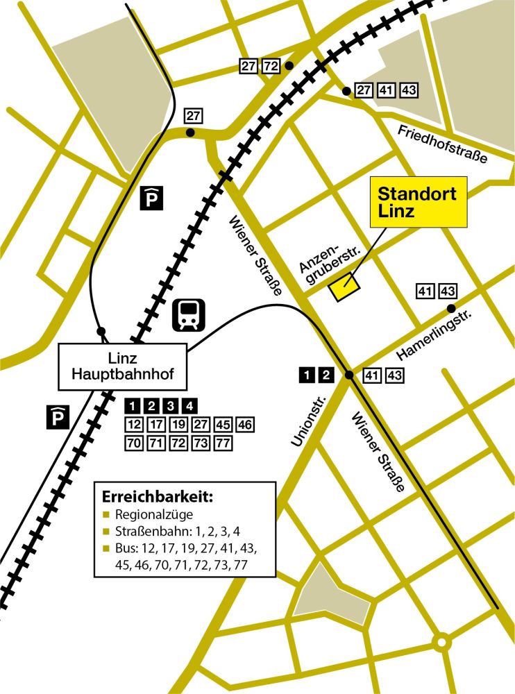 Der Standort Linz befindet sich in der Anzengruberstraße 6 in 4020 Linz, ungefähr 250 Meter von der Haltestelle Unionkreuzung entfernt. Die Haltestelle Unionkreuzung wird von den Straßenbahnlinien 1 und 2, von den Buslinien 41 und 43 der Linz AG, sowie des OÖ Verkehrsverbundes angefahren. Die Haltestellen der Buslinien liegen oberirdisch, wogegen sich die Straßenbahnhaltestelle im zweiten Tiefgeschoß unter der Straßenkreuzung befindet. Im ersten Tiefgeschoß befindet sich eine öffentliche WC-Anlage mit Behinderten-WC. Das Straßenniveau kann mit mehreren Stiegen, Rolltreppen (nur aufwärts) und insgesamt vier Aufzügen erreicht werden. Die Lifte sind barrierefrei und mit Sprachausgabe. Bei der Unionkreuzung geht man auf der rechten Straßenseite (absteigende ungerade Hausnummern) in Richtung Hauptbahnhof (Norden). Der Weg von der Unionkreuzung bis zur Anzengruberstraße ist mit einer taktilen Bodeninformation (TBI) ausgestattet, der man geradeaus folgt.