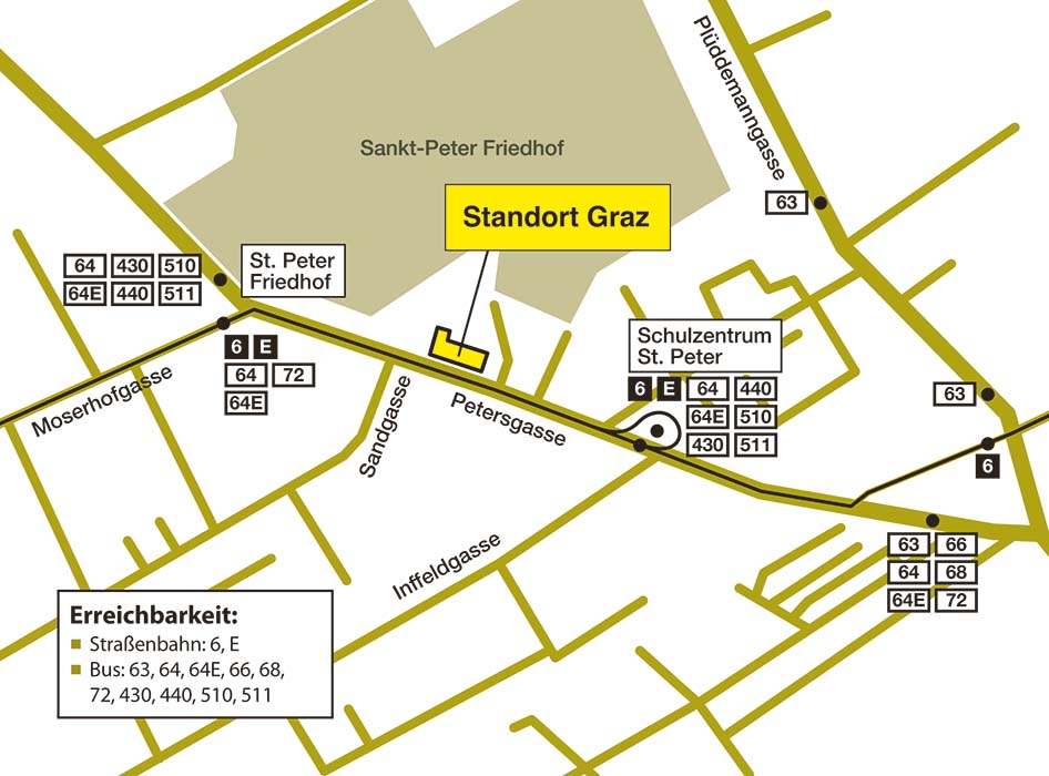 Der Standort Graz befindet sich in unmittelbarer Nähe der Haltestelle Schulzentrum St. Peter. Die Haltestelle ist mit der Straßenbahnlinie 6 und den Buslinien 64 und 64E erreichbar. Von dort geht man die Petersgasse auf der rechten Straßenseite ca. 100 Meter stadteinwärts Richtung St. Peter Stadtfriedhof. Vom Grazer Hauptbahnhof ist der Standort in ca. 25 Minuten mit der Straßenbahnlinie 6 zu erreichen. Vom Stadtzentrum aus sind es mit dem „6er“ etwa 15 Minuten. Aus der Richtung LKH Graz kommend, können Sie mit der Buslinie 64 oder der Buslinie 64E von der Haltestelle St. Leonhard/ Klinikum Mitte direkt bis zur Haltestelle Schulzentrum St. Peter fahren. In der Gegenrichtung nehmen Sie die Buslinie 64 beginnend mit der Haltestelle Puntigam, oder die Buslinie 64E beginnend mit der Haltestelle Liebenau/Murpark.